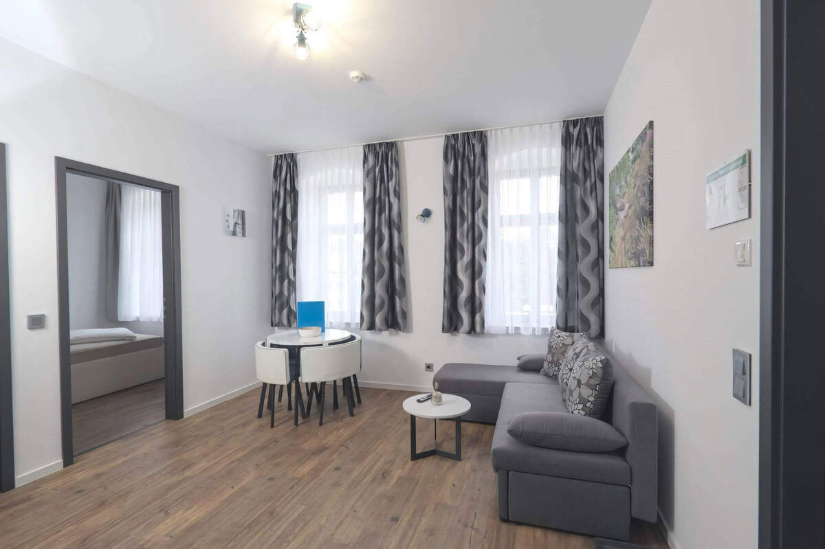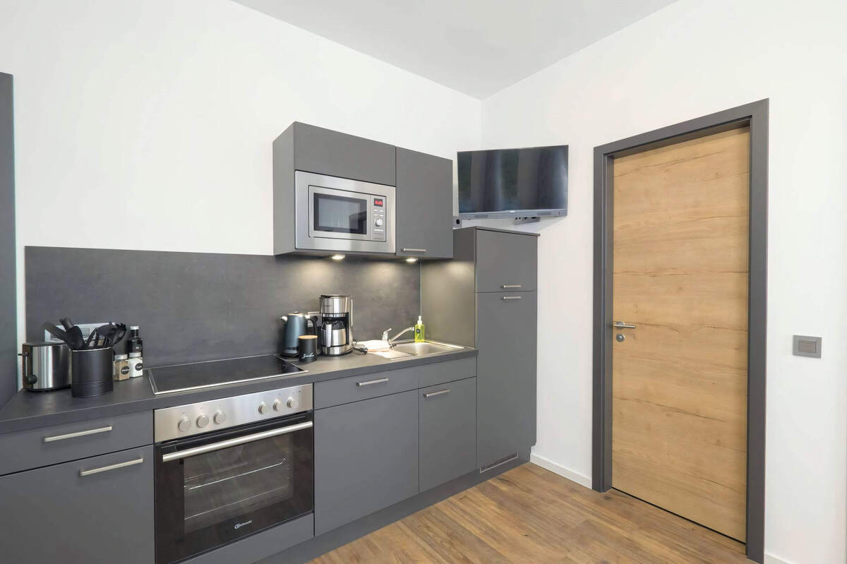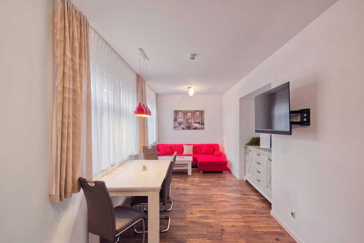 Wohnzimmer mit offener Küche, Schlafzimmer 1 Doppelbett, Bad
