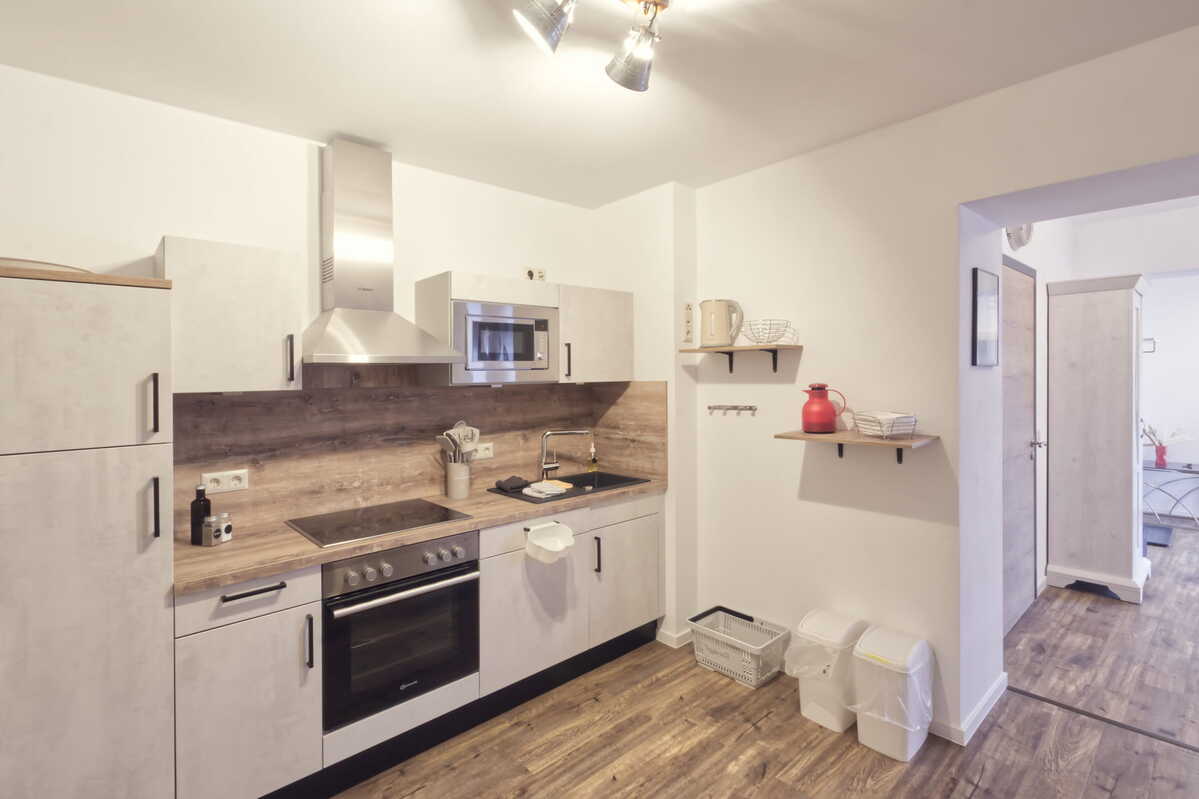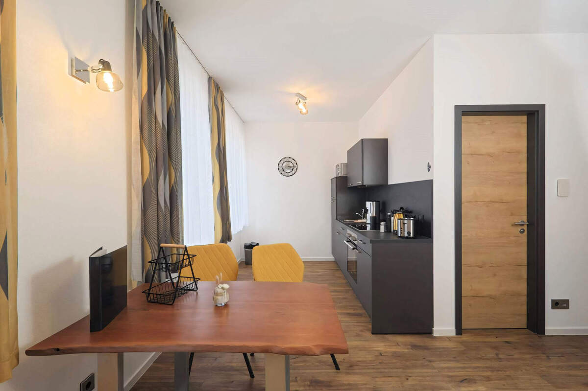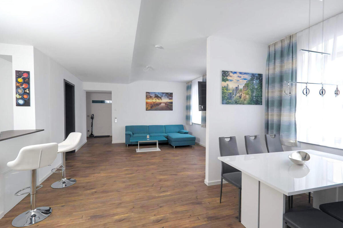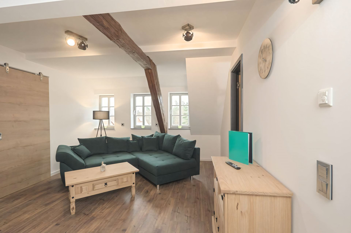 Wohnzimmer mit offener Küche, Schlafzimmer 1 Doppelbett, Bad