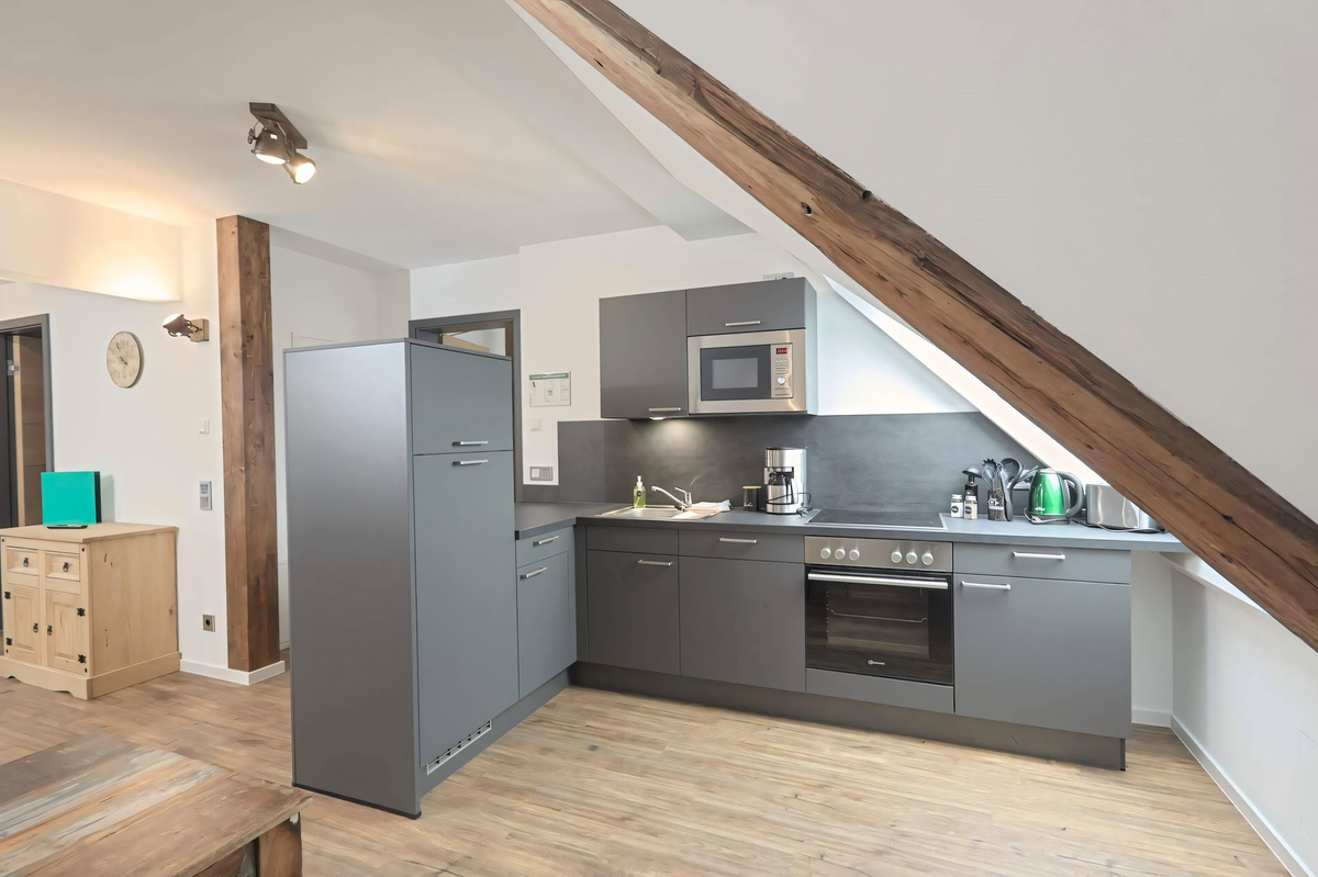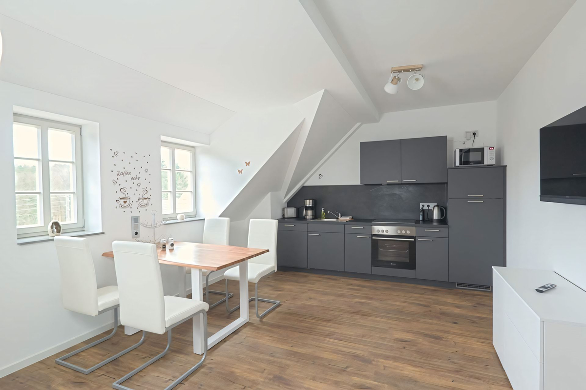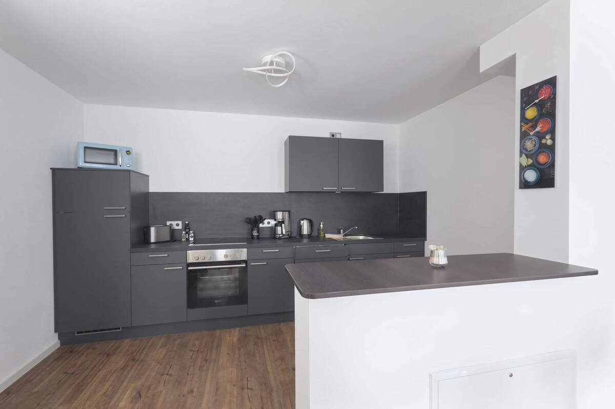 Wohnzimmer mit offener Küche, Schlafzimmer 1 Doppelbett,