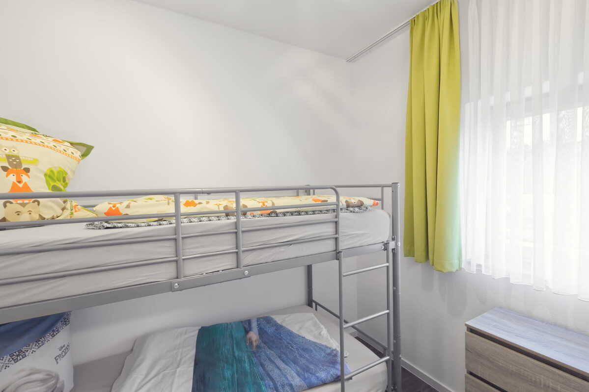 Wohnzimmer mit offener Küche, Schlafzimmer 1 Doppelbett, 1 Kinderzimmer, 1 Etagenbett 200 cm lang, Bad